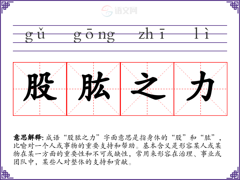 成语“股肱之力”字面意思是指身体的“股”和“肱”,比喻对一个人或事物的重要支持和帮助。基本含义是形容某人或某物在某一方面的重要性和不可或缺性,常用来形容在治理、事业或团队中,某些人对整体的支持和贡献。
