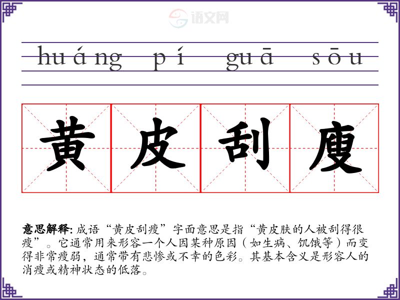 成语“黄皮刮瘦”字面意思是指“黄皮肤的人被刮得很瘦”。它通常用来形容一个人因某种原因(如生病、饥饿等)而变得非常瘦弱,通常带有悲惨或不幸的色彩。其基本含义是形容人的消瘦或精神状态的低落。