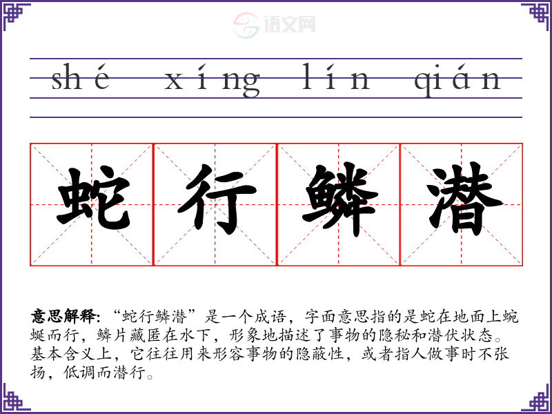 该成语出自《庄子·外物》,其中提到“蛇行鳞潜,故见于天”。它的起源与古代对蛇的观察与理解有关,蛇在古代文化中常被视为灵巧、隐秘的生物,能在不易察觉的情况下移动。成语的形成体现了古人对自然界的观察与哲学思考。