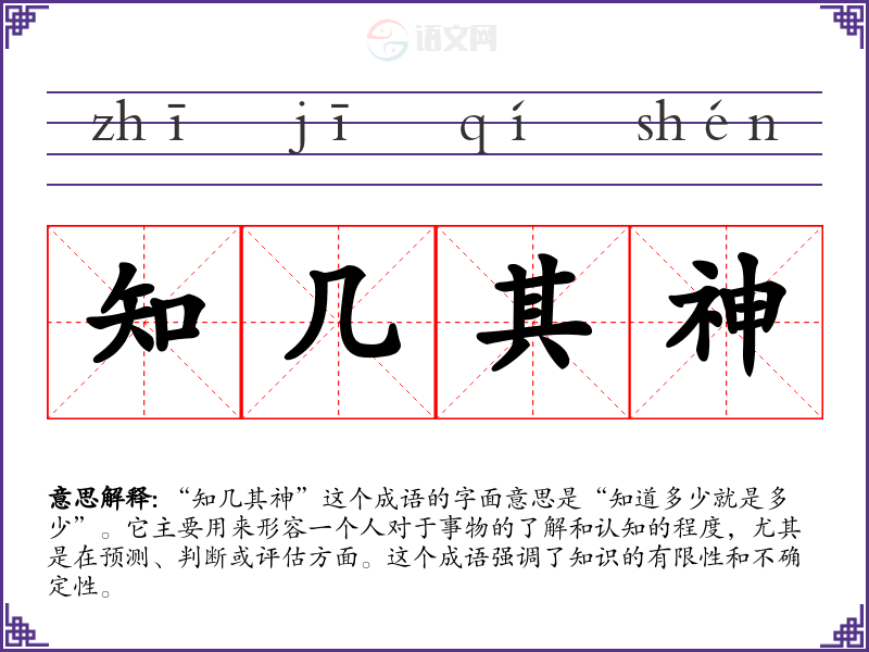 “知几其神”这个成语的字面意思是“知道多少就是多少”。它主要用来形容一个人对于事物的了解和认知的程度,尤其是在预测、判断或评估方面。这个成语强调了知识的有限性和不确定性。