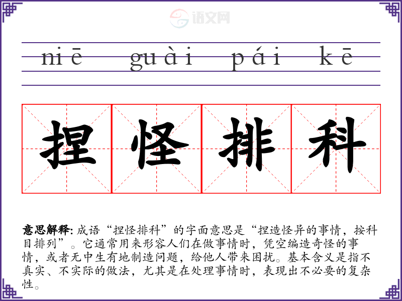 成语“捏怪排科”的字面意思是“捏造怪异的事情,按科目排列”。它通常用来形容人们在做事情时,凭空编造奇怪的事情,或者无中生有地制造问题,给他人带来困扰。基本含义是指不真实、不实际的做法,尤其是在处理事情时,表现出不必要的复杂性。