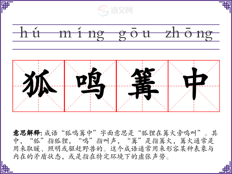 成语“狐鸣篝中”字面意思是“狐狸在篝火旁鸣叫”。其中,“狐”指狐狸,“鸣”指叫声,“篝”是指篝火,篝火通常是用来取暖、照明或驱赶野兽的。这个成语通常用来形容某种表象与内在的矛盾状态,或是指在特定环境下的虚张声势。