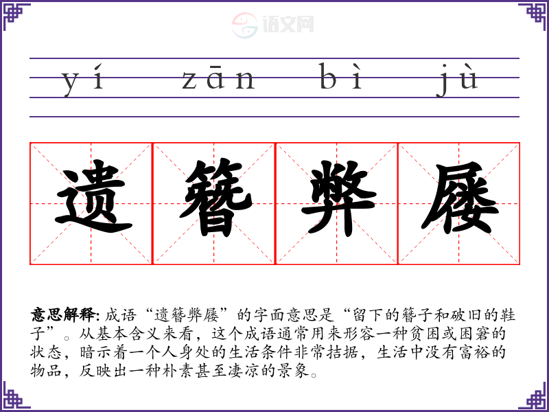 成语“遗簪弊屦”的字面意思是“留下的簪子和破旧的鞋子”。从基本含义来看,这个成语通常用来形容一种贫困或困窘的状态,暗示着一个人身处的生活条件非常拮据,生活中没有富裕的物品,反映出一种朴素甚至凄凉的景象。