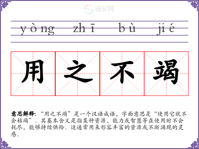 “用之不竭”是一个汉语成语,字面意思是“使用它就不会枯竭”。其基本含义是指某种资源、能力或智慧等在使用时不会耗尽,能够持续供给。这通常用来形容丰富的资源或不断涌现的灵感。