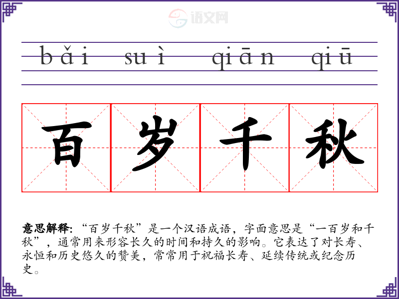 “百岁千秋”是一个汉语成语,字面意思是“一百岁和千秋”,通常用来形容长久的时间和持久的影响。它表达了对长寿、永恒和历史悠久的赞美,常常用于祝福长寿、延续传统或纪念历史。