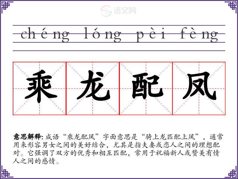 成语“乘龙配凤”字面意思是“骑上龙匹配上凤”,通常用来形容男女之间的美好结合,尤其是指夫妻或恋人之间的理想配对。它强调了双方的优秀和相互匹配,常用于祝福新人或赞美有情人之间的感情。