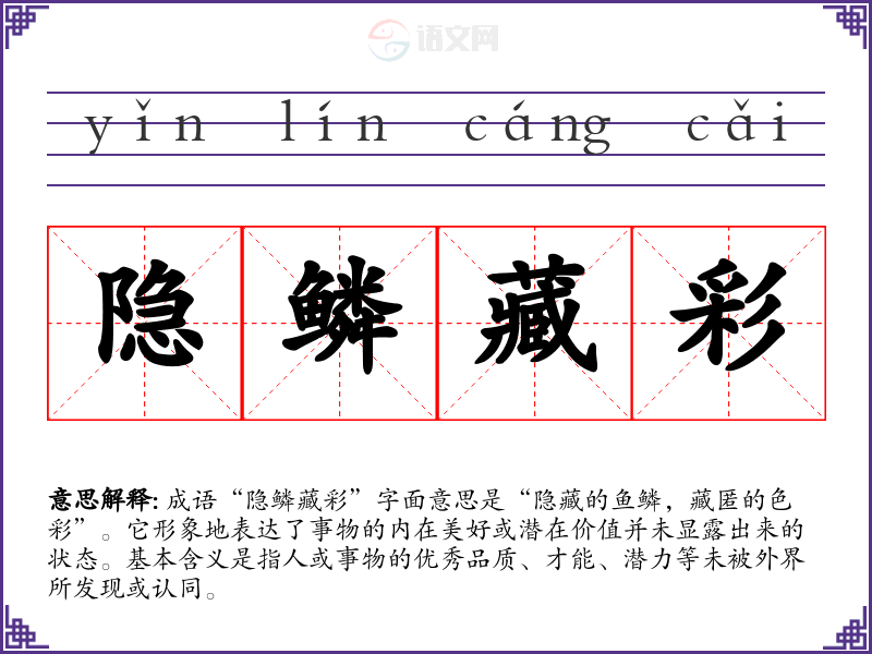 成语“隐鳞藏彩”字面意思是“隐藏的鱼鳞,藏匿的色彩”。它形象地表达了事物的内在美好或潜在价值并未显露出来的状态。基本含义是指人或事物的优秀品质、才能、潜力等未被外界所发现或认同。