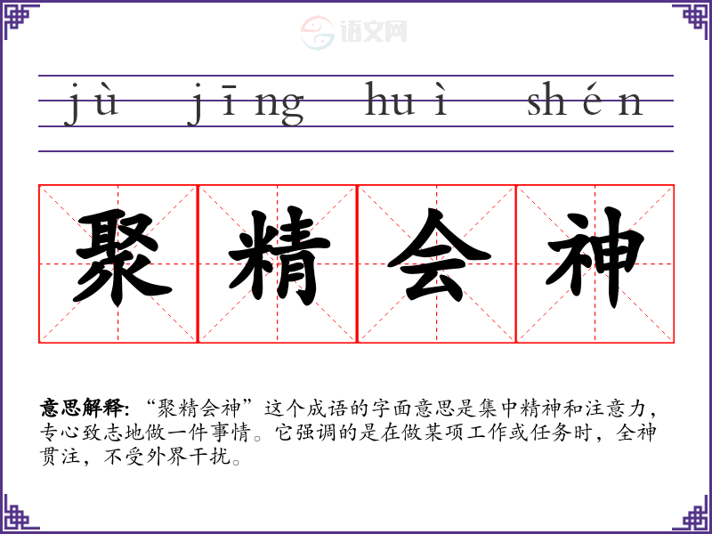 “聚精会神”这个成语的字面意思是集中精神和注意力,专心致志地做一件事情。它强调的是在做某项工作或任务时,全神贯注,不受外界干扰。