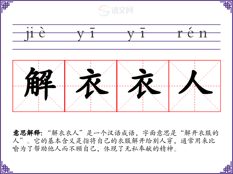 “解衣衣人”是一个汉语成语,字面意思是“解开衣服的人”。它的基本含义是指将自己的衣服解开给别人穿,通常用来比喻为了帮助他人而不顾自己,体现了无私奉献的精神。