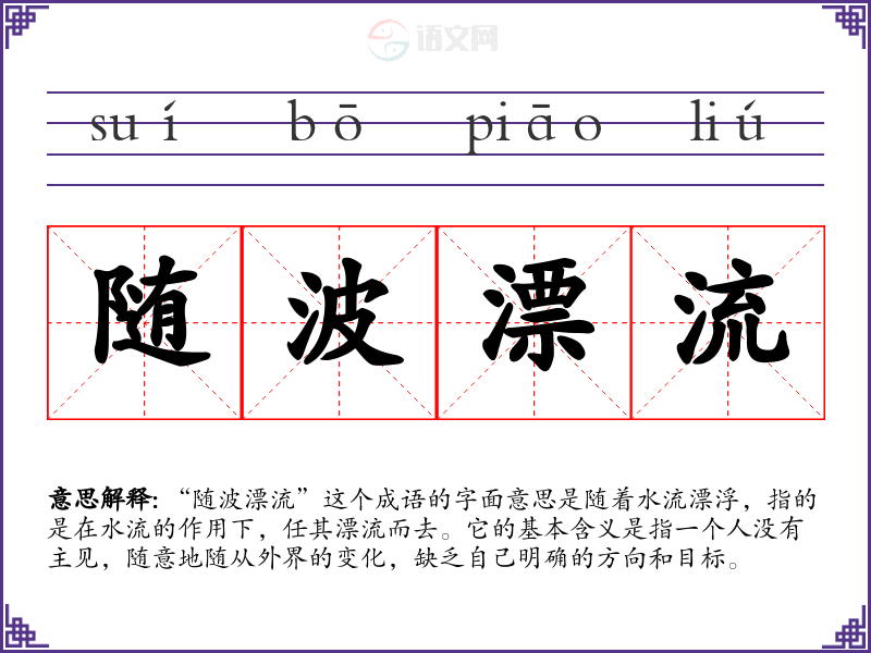 “随波漂流”这个成语的字面意思是随着水流漂浮,指的是在水流的作用下,任其漂流而去。它的基本含义是指一个人没有主见,随意地随从外界的变化,缺乏自己明确的方向和目标。