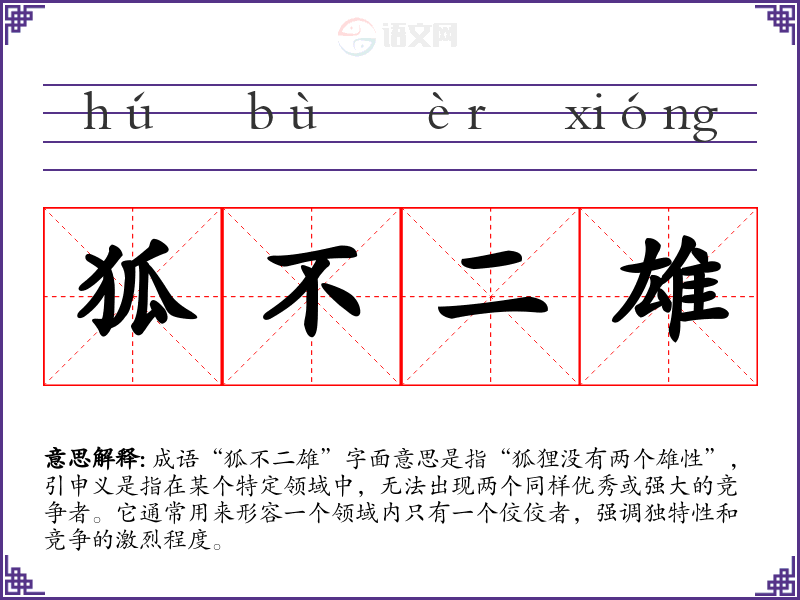 成语“狐不二雄”字面意思是指“狐狸没有两个雄性”,引申义是指在某个特定领域中,无法出现两个同样优秀或强大的竞争者。它通常用来形容一个领域内只有一个佼佼者,强调独特性和竞争的激烈程度。