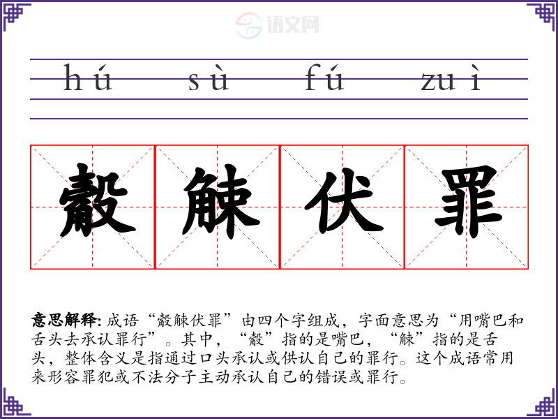 成语“觳觫伏罪”由四个字组成,字面意思为“用嘴巴和舌头去承认罪行”。其中,“觳”指的是嘴巴,“觫”指的是舌头,整体含义是指通过口头承认或供认自己的罪行。这个成语常用来形容罪犯或不法分子主动承认自己的错误或罪行。