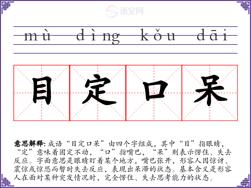 - “目瞪口呆”:与“目定口呆”意义相近,强调因惊讶而无法反应。