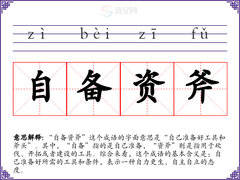 “自备资斧”这个成语的字面意思是“自己准备好工具和斧头”。其中,“自备”指的是自己准备,“资斧”则是指用于砍伐、开拓或者建设的工具。综合来看,这个成语的基本含义是:自己准备好所需的工具和条件,表示一种自力更生、自主自立的态度。