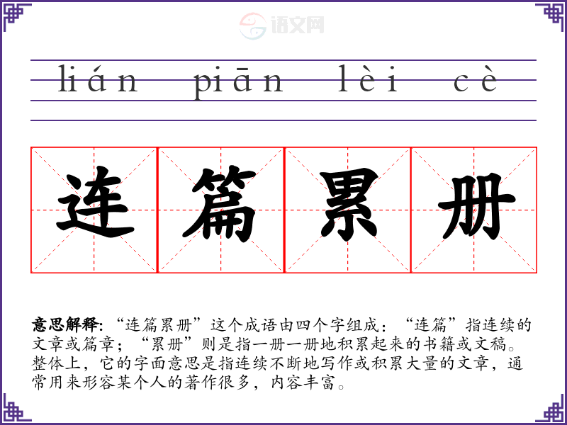 “连篇累册”这个成语由四个字组成:“连篇”指连续的文章或篇章;“累册”则是指一册一册地积累起来的书籍或文稿。整体上,它的字面意思是指连续不断地写作或积累大量的文章,通常用来形容某个人的著作很多,内容丰富。