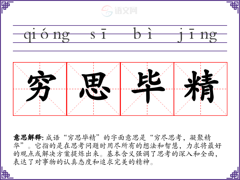 成语“穷思毕精”的字面意思是“穷尽思考,凝聚精华”。它指的是在思考问题时用尽所有的想法和智慧,力求将最好的观点或解决方案提炼出来。基本含义强调了思考的深入和全面,表达了对事物的认真态度和追求完美的精神。