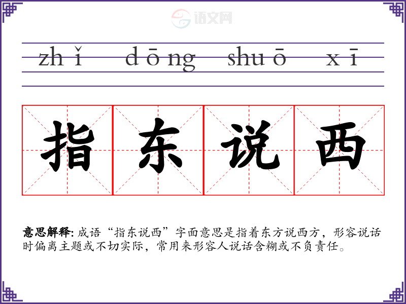 成语“指东说西”字面意思是指着东方说西方,形容说话时偏离主题或不切实际,常用来形容人说话含糊或不负责任。