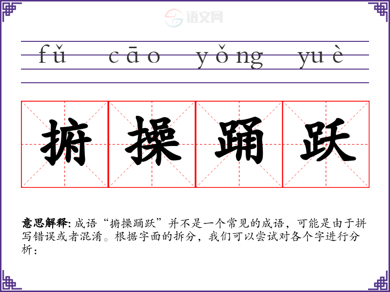 成语“捬操踊跃”并不是一个常见的成语,可能是由于拼写错误或者混淆。根据字面的拆分,我们可以尝试对各个字进行分析: