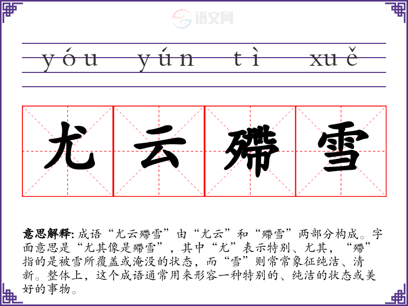 成语“尤云殢雪”由“尤云”和“殢雪”两部分构成。字面意思是“尤其像是殢雪”,其中“尤”表示特别、尤其,“殢”指的是被雪所覆盖或淹没的状态,而“雪”则常常象征纯洁、清新。整体上,这个成语通常用来形容一种特别的、纯洁的状态或美好的事物。