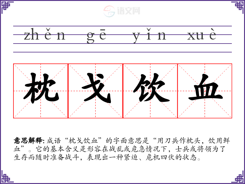 成语“枕戈饮血”的字面意思是“用刀兵作枕头,饮用鲜血”。它的基本含义是形容在战乱或危急情况下,士兵或将领为了生存而随时准备战斗,表现出一种紧迫、危机四伏的状态。