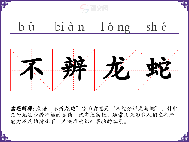 成语“不辨龙蛇”字面意思是“不能分辨龙与蛇”,引申义为无法分辨事物的真伪、优劣或高低。通常用来形容人们在判断能力不足的情况下,无法准确识别事物的本质。