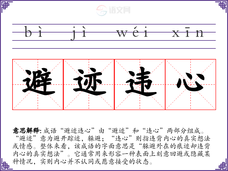 成语“避迹违心”由“避迹”和“违心”两部分组成。“避迹”意为避开踪迹,躲避;“违心”则指违背内心的真实想法或情感。整体来看,该成语的字面意思是“躲避外在的痕迹却违背内心的真实想法”。它通常用来形容一种表面上刻意回避或隐藏某种情况,实则内心并不认同或愿意接受的状态。
