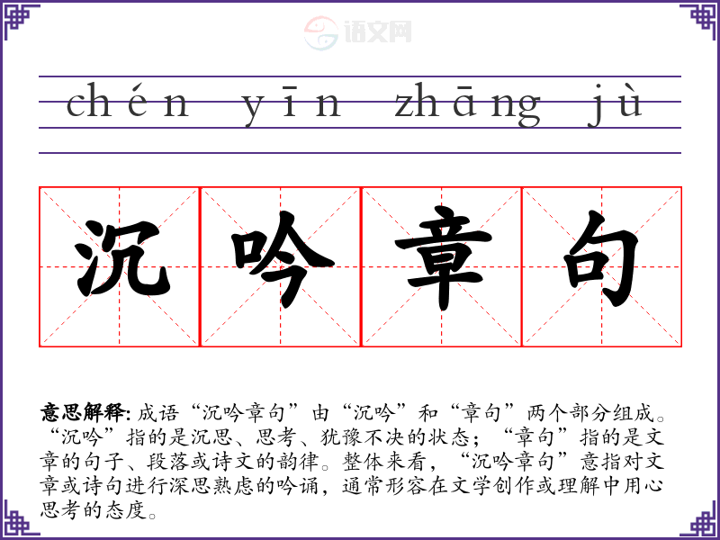 成语“沉吟章句”由“沉吟”和“章句”两个部分组成。“沉吟”指的是沉思、思考、犹豫不决的状态;“章句”指的是文章的句子、段落或诗文的韵律。整体来看,“沉吟章句”意指对文章或诗句进行深思熟虑的吟诵,通常形容在文学创作或理解中用心思考的态度。