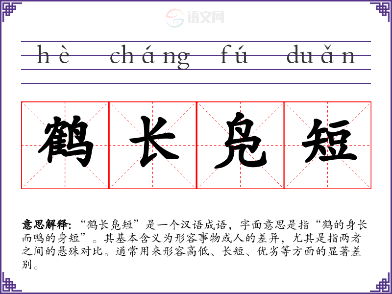 “鹤长凫短”是一个汉语成语,字面意思是指“鹤的身长而鸭的身短”。其基本含义为形容事物或人的差异,尤其是指两者之间的悬殊对比。通常用来形容高低、长短、优劣等方面的显著差别。