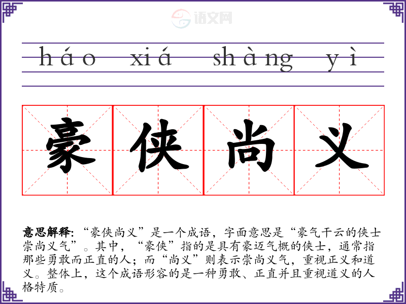 “豪侠尚义”是一个成语,字面意思是“豪气干云的侠士崇尚义气”。其中,“豪侠”指的是具有豪迈气概的侠士,通常指那些勇敢而正直的人;而“尚义”则表示崇尚义气,重视正义和道义。整体上,这个成语形容的是一种勇敢、正直并且重视道义的人格特质。