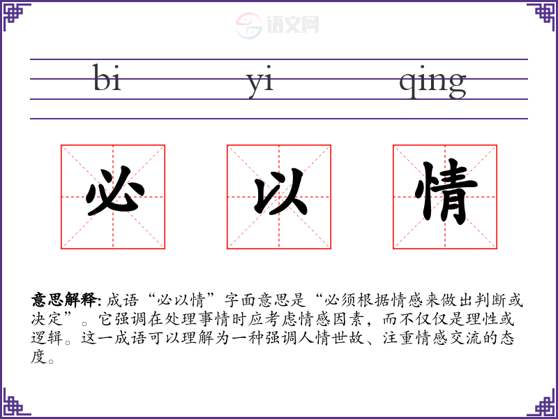成语“必以情”字面意思是“必须根据情感来做出判断或决定”。它强调在处理事情时应考虑情感因素,而不仅仅是理性或逻辑。这一成语可以理解为一种强调人情世故、注重情感交流的态度。