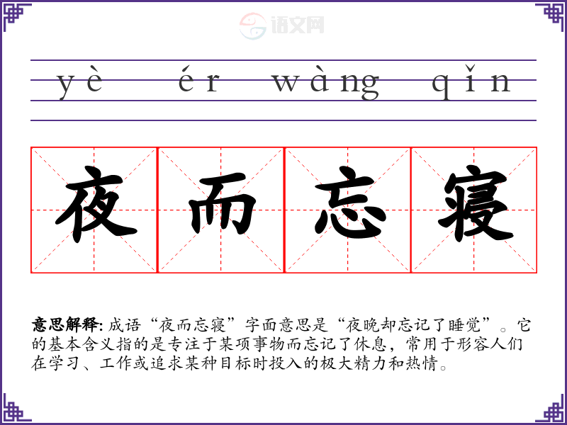成语“夜而忘寝”字面意思是“夜晚却忘记了睡觉”。它的基本含义指的是专注于某项事物而忘记了休息,常用于形容人们在学*、工作或追求某种目标时投入的极大精力和热情。