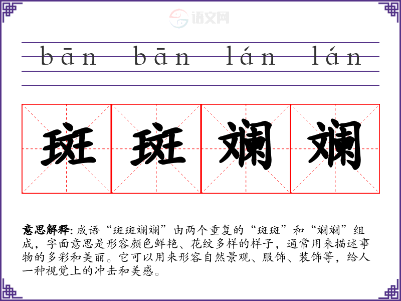 - 文学作品:描述风景、人物服饰或艺术作品的美丽。例如:诗人描写春天的花海时,可以用“斑斑斓斓的花朵绽放在田野上”。
