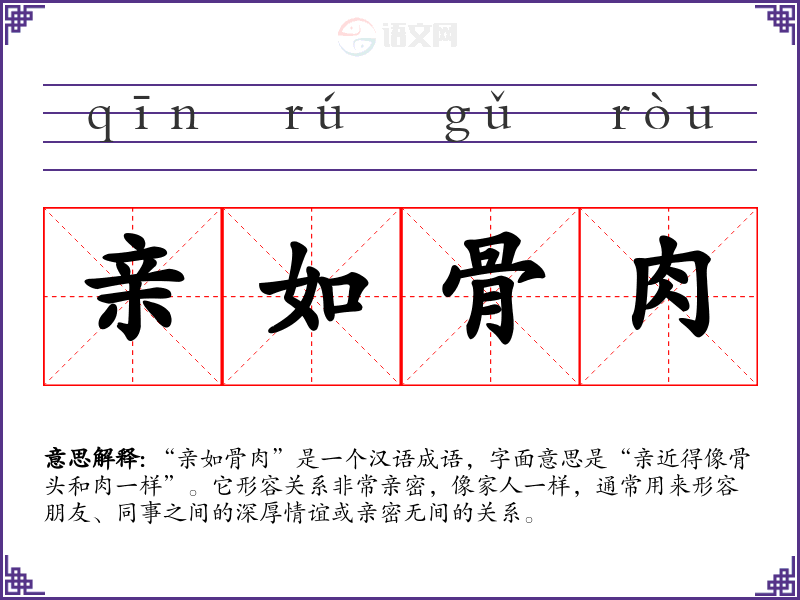 “亲如骨肉”是一个汉语成语,字面意思是“亲近得像骨头和肉一样”。它形容关系非常亲密,像家人一样,通常用来形容朋友、同事之间的深厚情谊或亲密无间的关系。