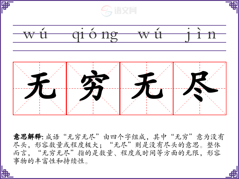 成语“无穷无尽”由四个字组成,其中“无穷”意为没有尽头,形容数量或程度极大;“无尽”则是没有尽头的意思。整体而言,“无穷无尽”指的是数量、程度或时间等方面的无限,形容事物的丰富性和持续性。