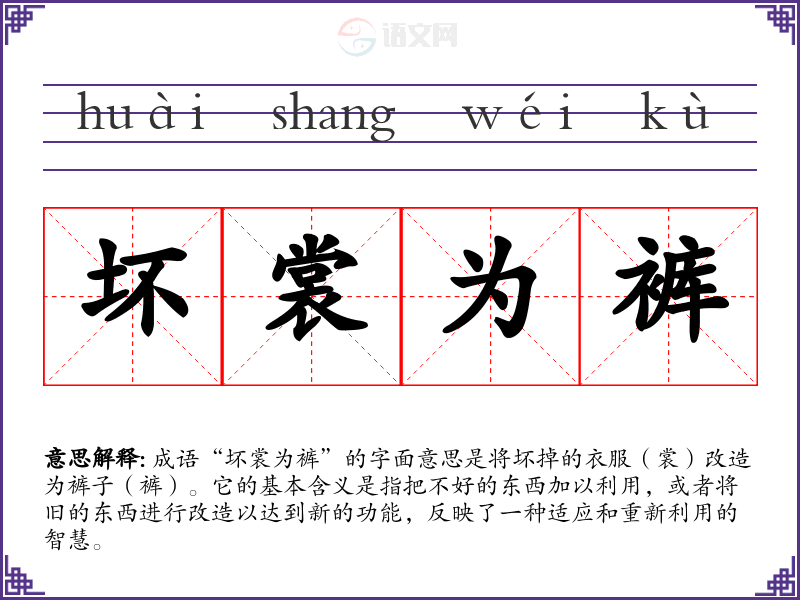 成语“坏裳为裤”的字面意思是将坏掉的衣服(裳)改造为裤子(裤)。它的基本含义是指把不好的东西加以利用,或者将旧的东西进行改造以达到新的功能,反映了一种适应和重新利用的智慧。