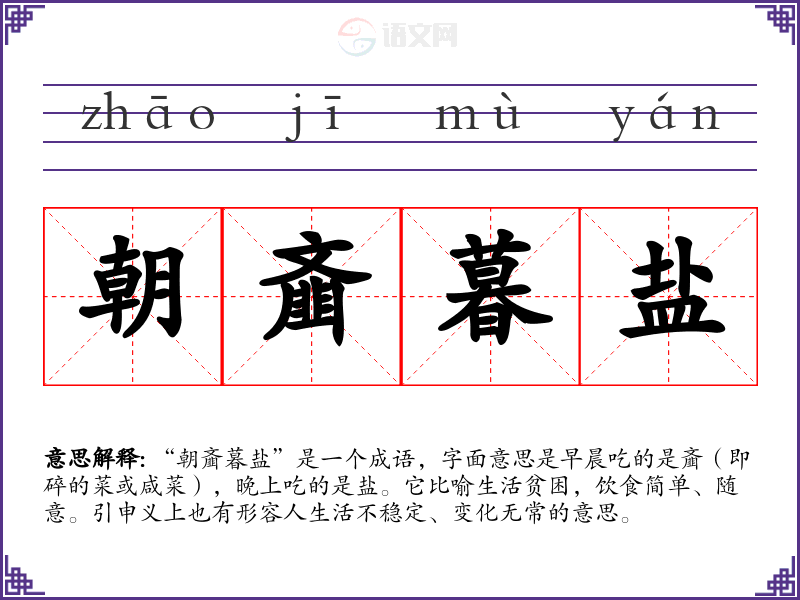 该成语源于《左传》,其中有提到“朝食齑,夕食盐”的说法。这句古语强调了古代人们生活的艰辛和贫困,说明了饮食的简单和生活的变化。成语中的“朝”和“暮”分别表示早晨和晚上,结合“齑”和“盐”则表现出生活中食物的贫乏。