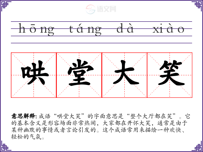 成语“哄堂大笑”的字面意思是“整个大厅都在笑”。它的基本含义是形容场面非常热闹,大家都在开怀大笑,通常是由于某种幽默的事情或者言论引发的。这个成语常用来描绘一种欢快、轻松的气氛。