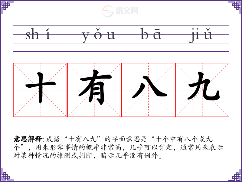 成语“十有**”的字面意思是“十个中有八个或九个”,用来形容事情的概率非常高,几乎可以肯定,通常用来表示对某种情况的推测或判断,暗示几乎没有例外。