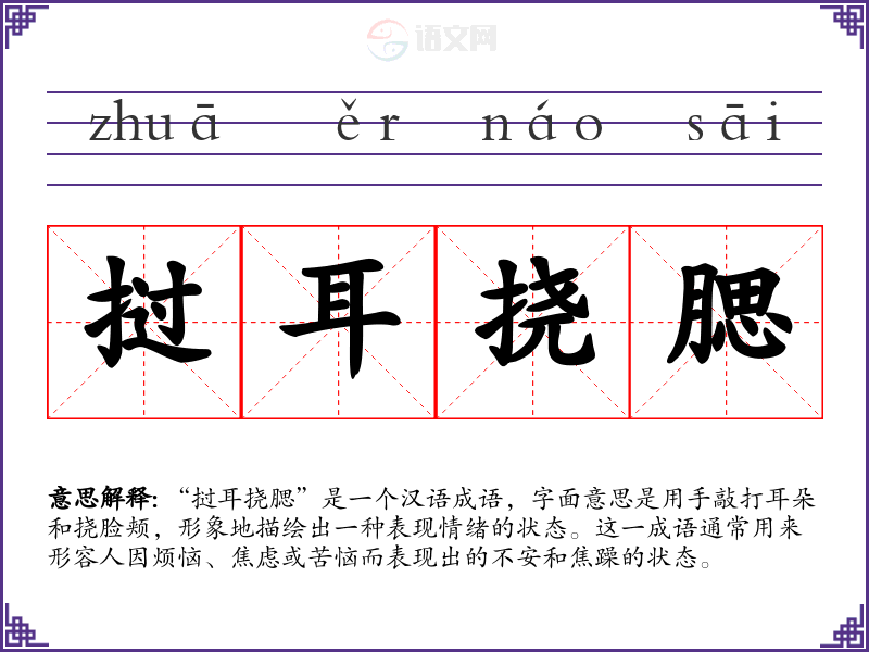 “挝耳挠腮”是一个汉语成语,字面意思是用手敲打耳朵和挠脸颊,形象地描绘出一种表现情绪的状态。这一成语通常用来形容人因烦恼、焦虑或苦恼而表现出的不安和焦躁的状态。