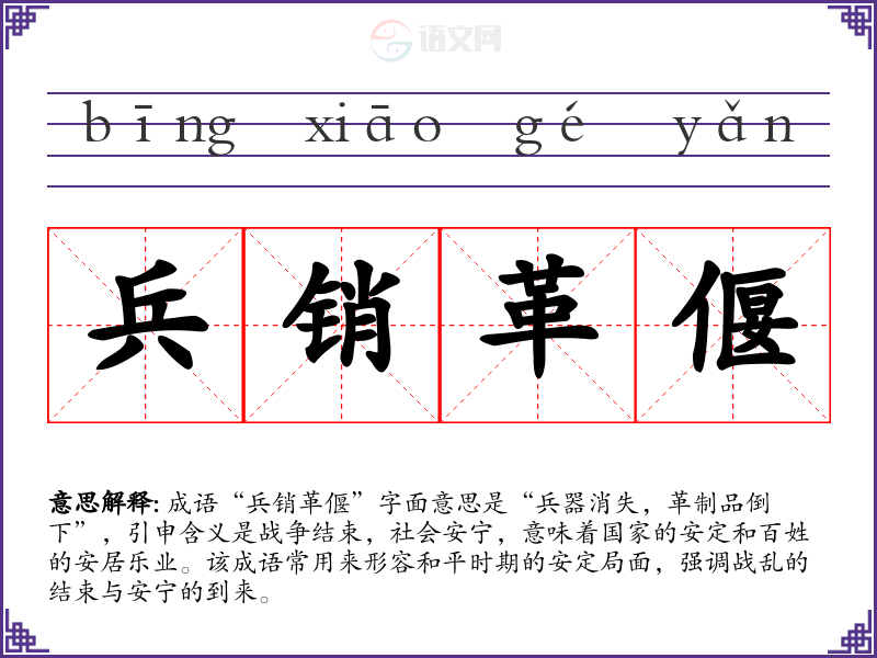 成语“兵销革偃”字面意思是“兵器消失,革制品倒下”,引申含义是战争结束,社会安宁,意味着国家的安定和百姓的安居乐业。该成语常用来形容和平时期的安定局面,强调战乱的结束与安宁的到来。