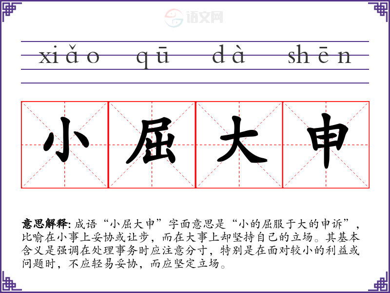 通过对“小屈大申”的学*,我理解到在生活和工作中处理问题的艺术,尤其是如何在小事上灵活处理,而在大事上坚持原则。这不仅丰富了我的语言表达,也让我在实际生活中更加注重分寸和智慧的运用。