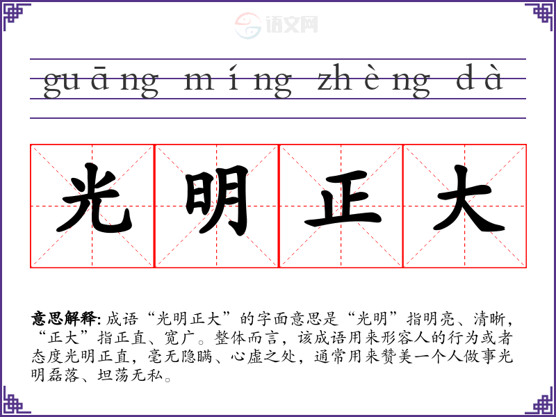 成语“光明正大”的字面意思是“光明”指明亮、清晰,“正大”指正直、宽广。整体而言,该成语用来形容人的行为或者态度光明正直,毫无隐瞒、心虚之处,通常用来赞美一个人做事光明磊落、坦荡无私。