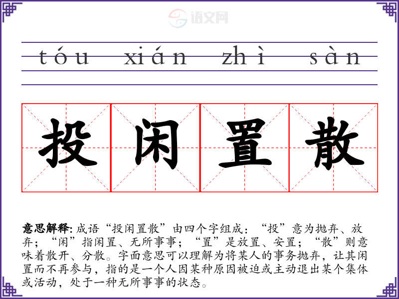 成语“投闲置散”由四个字组成:“投”意为抛弃、放弃;“闲”指闲置、无所事事;“置”是放置、安置;“散”则意味着散开、分散。字面意思可以理解为将某人的事务抛弃,让其闲置而不再参与,指的是一个人因某种原因被迫或主动退出某个集体或活动,处于一种无所事事的状态。