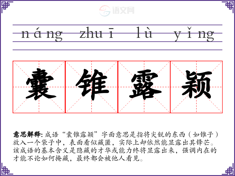 成语“囊锥露颖”字面意思是指将尖锐的东西(如锥子)放入一个袋子中,表面看似藏匿,实际上却依然能显露出其锋芒。该成语的基本含义是隐藏的才华或能力终将显露出来,强调内在的才能不论如何掩藏,最终都会被他人看见。