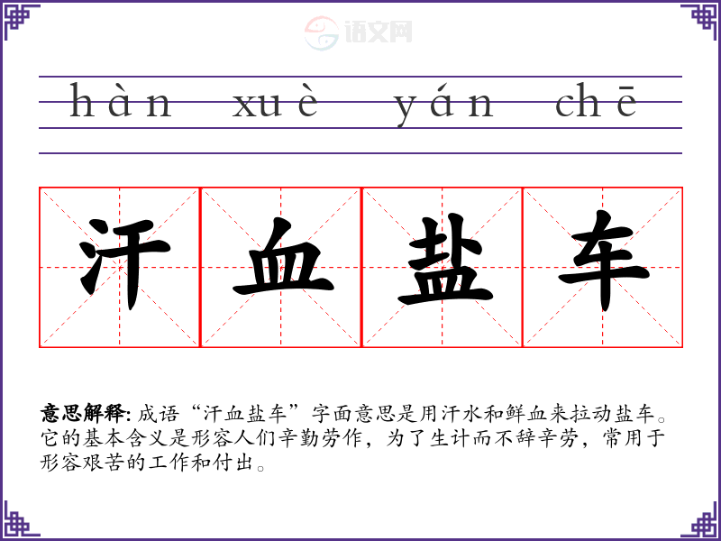 成语“汗血盐车”字面意思是用汗水和鲜血来拉动盐车。它的基本含义是形容人们辛勤劳作,为了生计而不辞辛劳,常用于形容艰苦的工作和付出。
