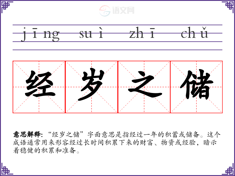 “经岁之储”字面意思是指经过一年的积蓄或储备。这个成语通常用来形容经过长时间积累下来的财富、物资或经验,暗示着稳健的积累和准备。