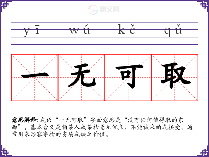 成语“一无可取”字面意思是“没有任何值得取的东西”,基本含义是指某人或某物毫无优点,不能被采纳或接受,通常用来形容事物的劣质或缺乏价值。
