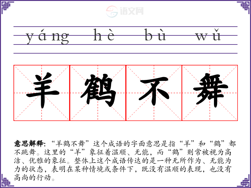 在**文化中,羊象征着温顺和忍耐,而鹤则象征着长寿和高雅。因此,“羊鹤不舞”可视为对一种消极状态的反映,尤其在社会竞争激烈、压力大的现代环境中,许多人可能会感到无所作为。在这种情况下,成语的使用也许能引起共鸣。