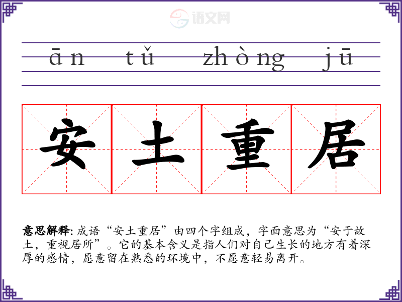成语“安土重居”由四个字组成,字面意思为“安于故土,重视居所”。它的基本含义是指人们对自己生长的地方有着深厚的感情,愿意留在熟悉的环境中,不愿意轻易离开。
