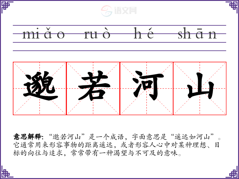 “邈若河山”是一个成语,字面意思是“遥远如河山”。它通常用来形容事物的距离遥远,或者形容人心中对某种理想、目标的向往与追求,常常带有一种渴望与不可及的意味。